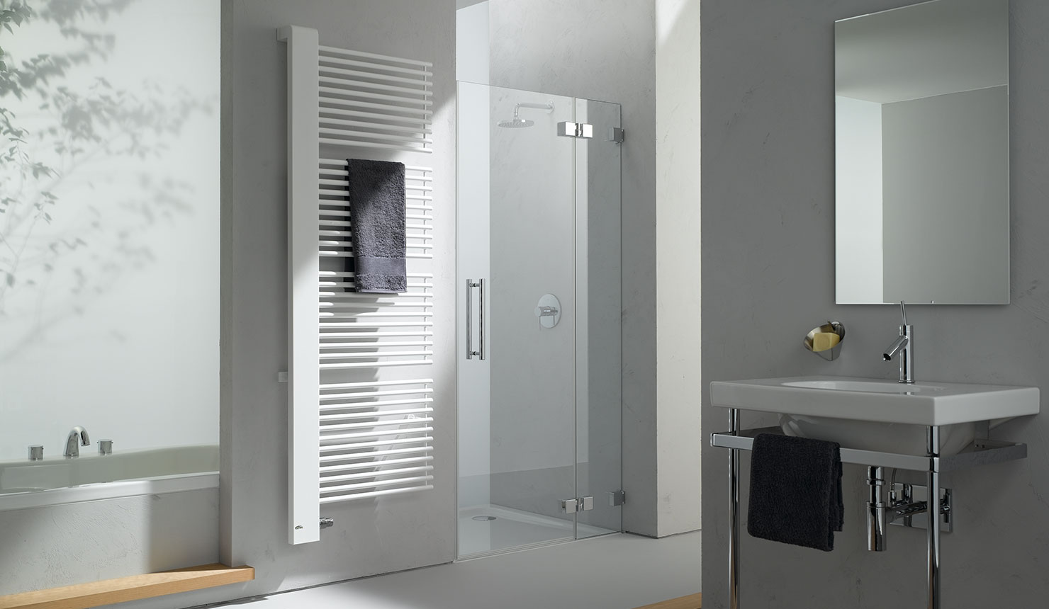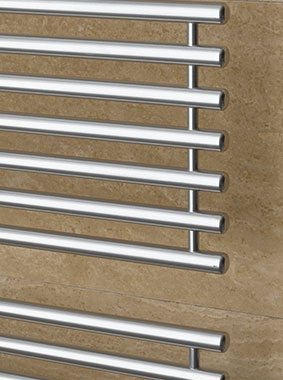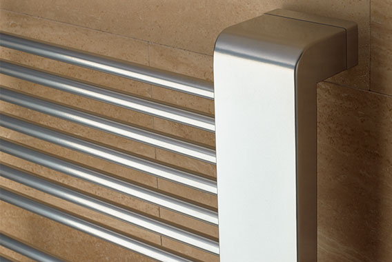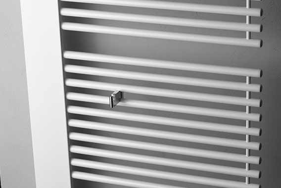 příčné trubky vytvářejí půvabný kontrast k plochému designu clony. Se svislými výztuhami pro účinnou stabilizaci. Uspořádání v charakteristických blocích a z boku otevřené pro optimální komfort. Ručníky lze tak při sušení a zahřívání pohodlně nasunout ze strany. Vysoká kvalita designu, materiálu i zpracování a vynikající funkčnost – rychlé, rovnoměrné nahřátí a vynikající topný výkon – činí z provedení Credo-Half® ideální řešení vytápění pro náročnou moderní koupelnu. Kompletní připojovací technika chytře skrytá pod plochou designovou clonou vč. skvěle integrované termostatické hlavice. Výběr z pěti rozměrů a až dvaceti barev. Variabilní dvou barevné provedení - kryt v barevném kontrastu s radiátorem. Možnost doplnit o praktické háčky.