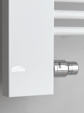 Otopné těleso pro teplovodní vytápění včetně připojovacích šroubení a termostatické hlavice. Volitelné pravostranné nebo levostranné provedení.