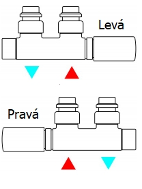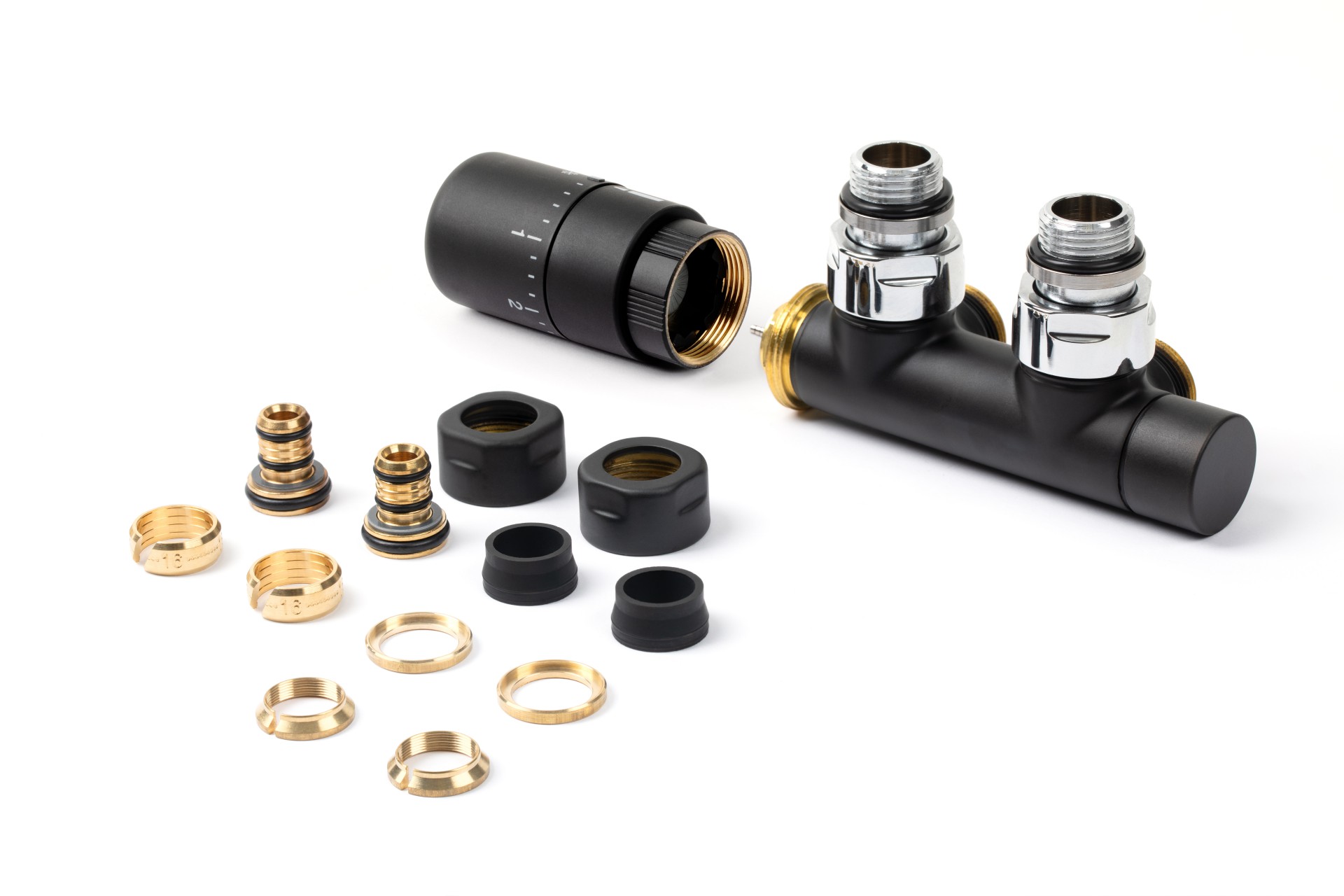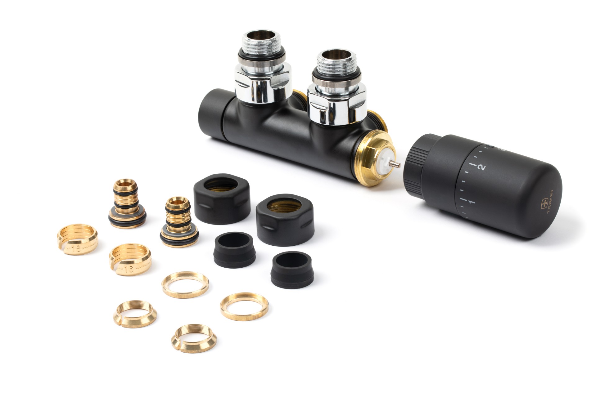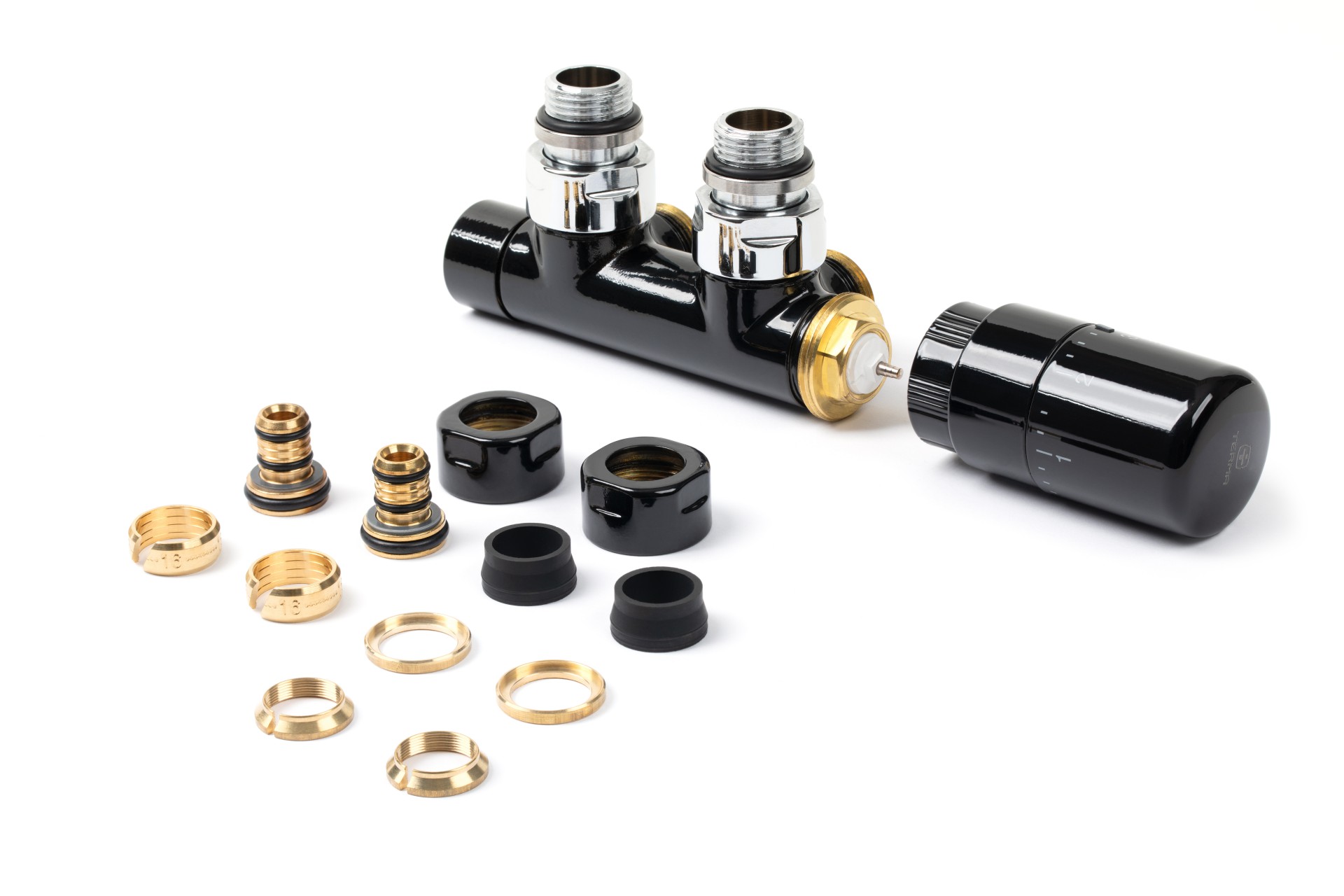 komplexní termostatická sada pro připojení radiátoru ze zdi s roztečí 50 mm.