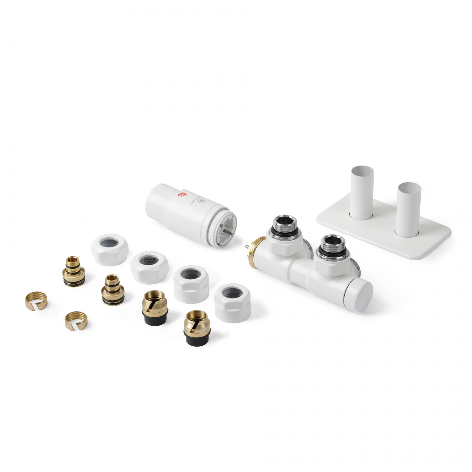 Kompletní ventilová termostatická sada TERMA Twins All In One pro připojení radiátoru na trubky ze zdi.