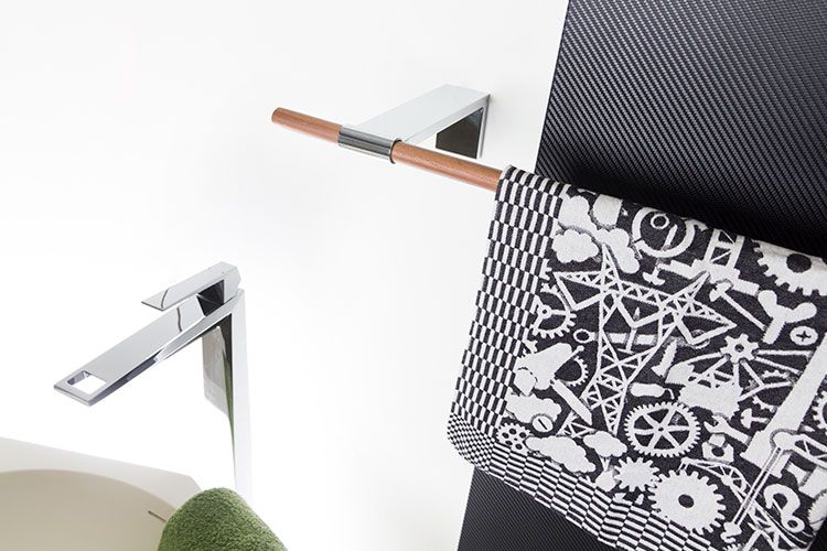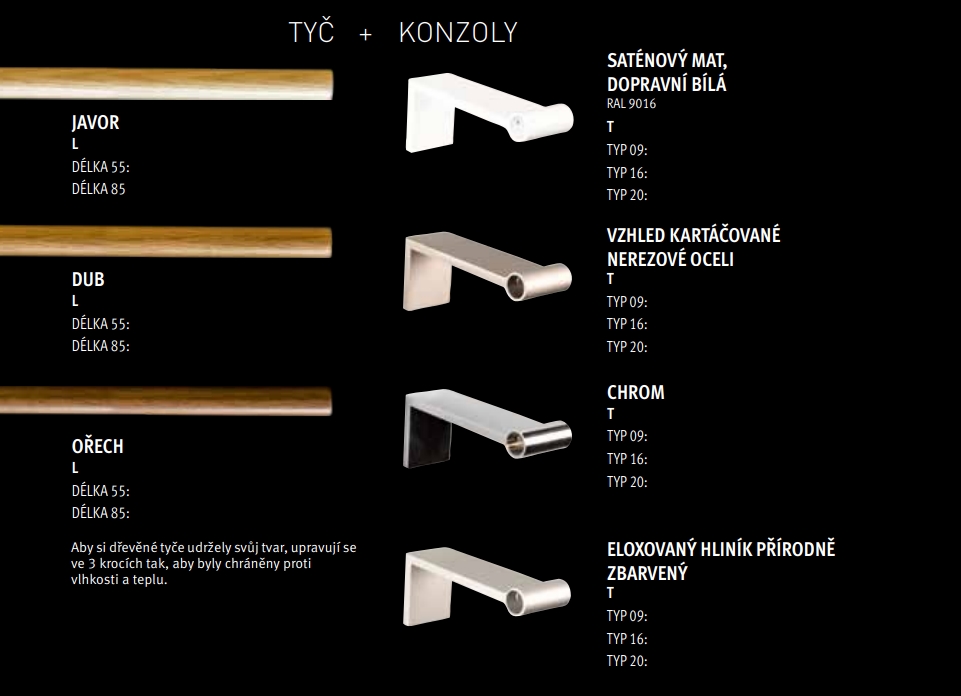 Konzoly sú vyrobené z extrudovaného hliníka a sú k dispozícii v štyroch povrchových úpravách: saténovo matná - dopravná biela, eloxovaný hliník v prírodnej farbe, vzhľad brúsenej nehrdzavejúcej ocele alebo chróm. Držiaky sú k dispozícii v troch rôznych dĺžkach. Tým sa zabezpečí optimálna vzdialenosť medzi držiakom a stenou alebo radiátorom vo všetkých situáciách. Drevená tyč MIKADO je k dispozícii v dvoch dĺžkach a prevedeniach: dub, javor a orech. Na pripevnenie 55 cm dlhého držiaka stačí použiť jeden držiak, ktorý možno podľa preferencií umiestniť buď na koniec, alebo do stredu stĺpa. V prípade držiaka s dĺžkou 85 cm sa musia na upevnenie použiť dva držiaky.
